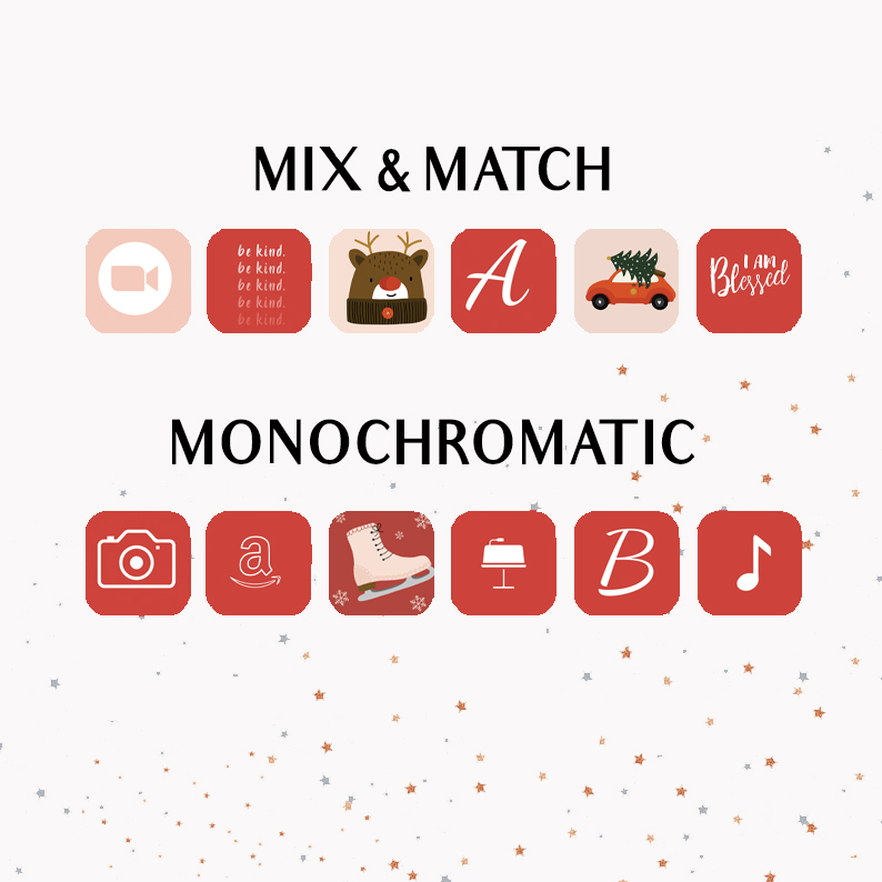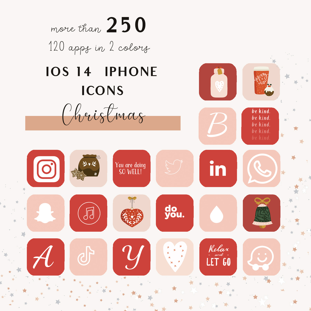 Christmas pink palette App Icons for IOS 14 â–² THIS SET INCLUDED - ZIP folders with more than 120 icons in 2 different colors, (complete list below). - Alphabet letter. (in 2colors) - Special Christmas designs - PDF with step by step instructions for IPHONE AND IPAD.